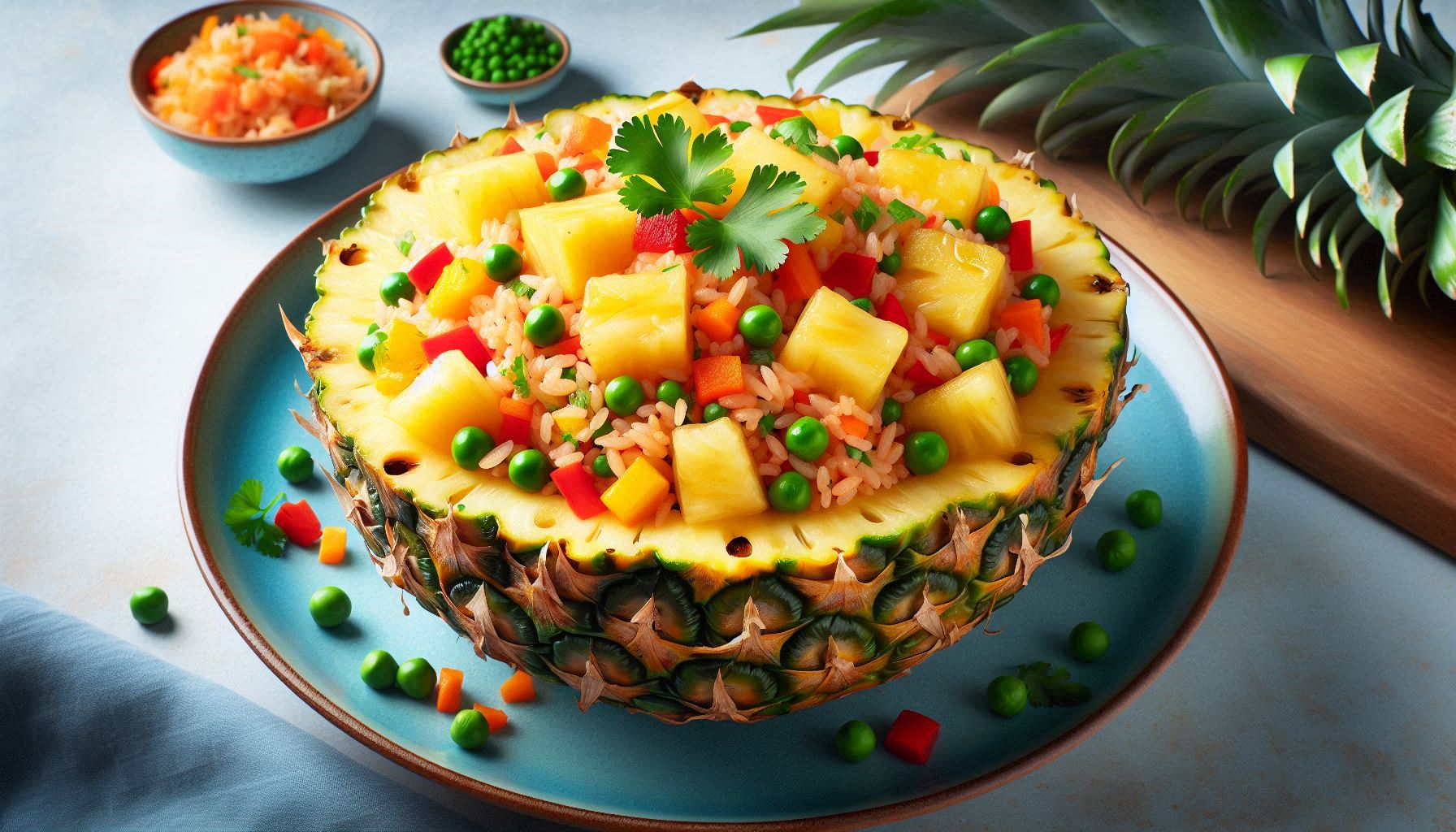 볶음밥을 그릇에 담을 때는 중앙을 높게 쌓아 올려 볼륨감을 줍니다. 파인애플 볶음밥의 황금빛 색상이 돋보이도록, 밝은 색의 그릇을 선택하는 것이 좋습니다.